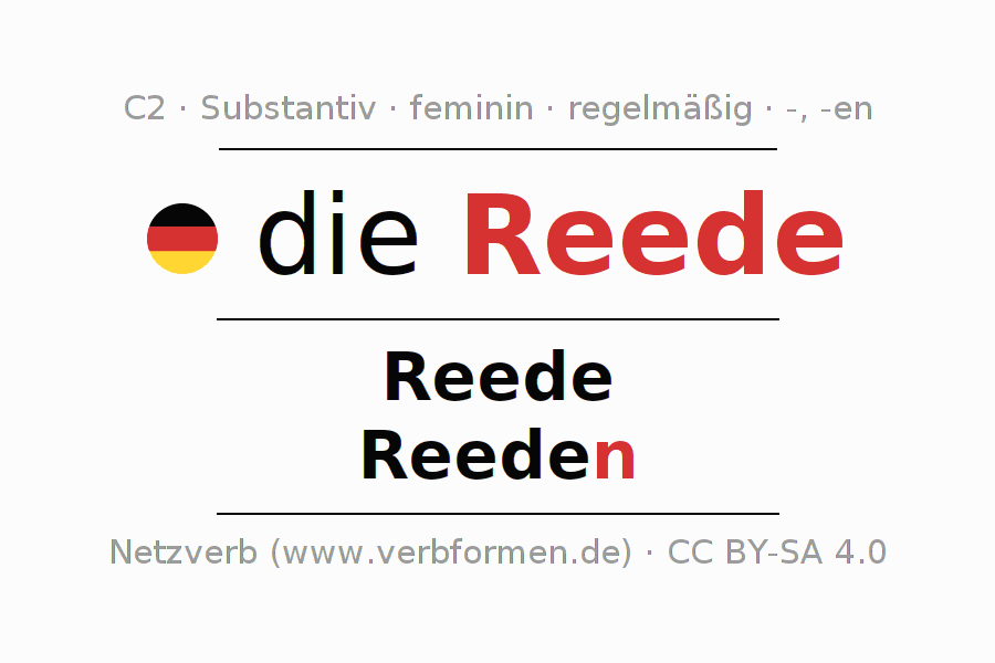 Die Deklination des Substantivs Reede ist im Singular Genitiv Reede und im Plural Nominativ Reeden. Das Nomen Reede wird schwach mit den Deklinationsendungen -/n dekliniert. Das Genus bzw. grammatische Geschlecht von Reede ist Feminin und der bestimmte Artikel ist "die". Man kann hier nicht nur Reede deklinieren, sondern alle deutschen Substantive. Das Substantiv gehört zum Wortschatz des Zertifikats Deutsch bzw. zur Stufe C2. Kommentare ☆