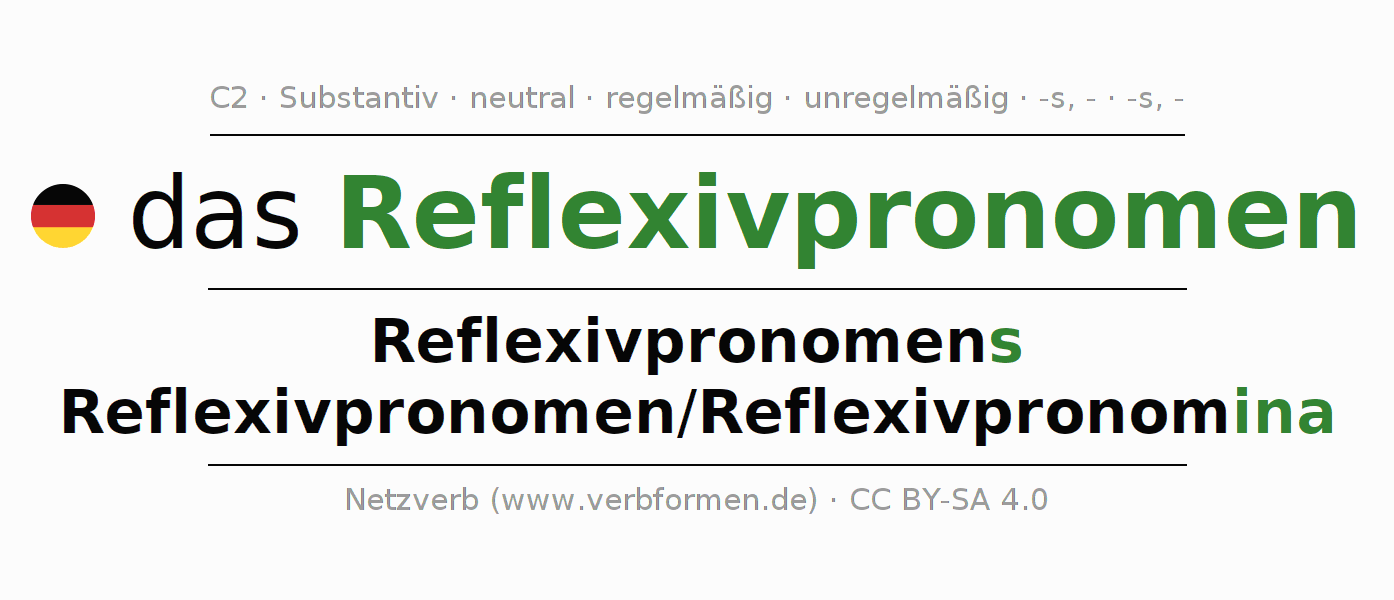 - Singular: das Reflexivpronomen, des Reflexivpronomens, dem Reflexivpronomen, das Reflexivpronomen
