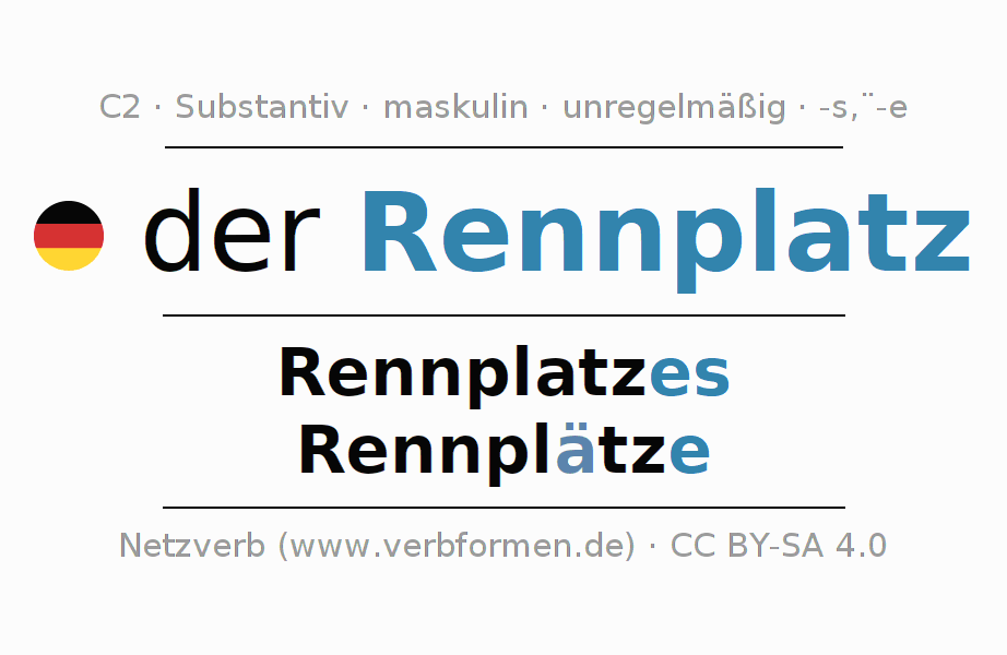 - Singular: der Rennplatz, des Rennplatzes, dem Rennplatz(e), den Rennplatz