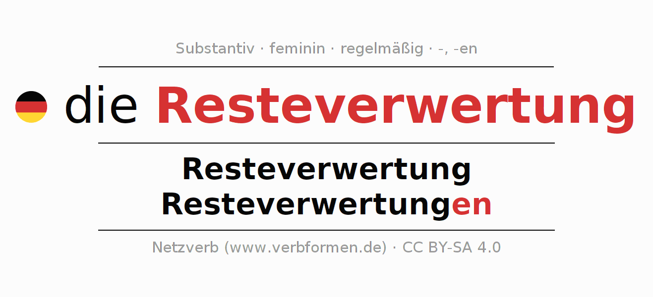 - Singular: die Resteverwertung, der Resteverwertung, der Resteverwertung, die Resteverwertung