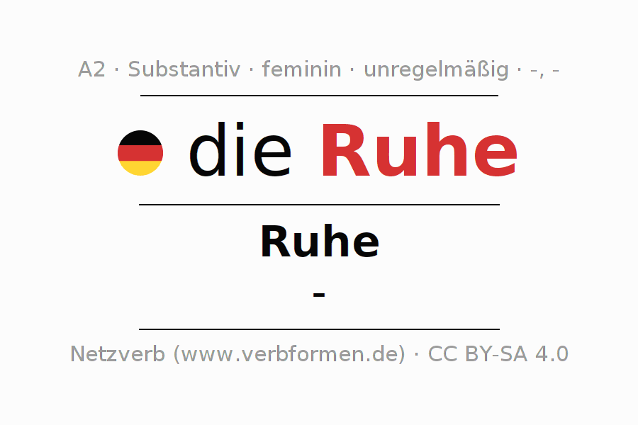 Die Deklination des Substantivs Ruhe ist im Singular Genitiv Ruhe und im Plural Nominativ -. Das Nomen Ruhe wird mit den Deklinationsendungen -/- dekliniert. Es bildet keine Pluralformen. Das Genus bzw. grammatische Geschlecht von Ruhe ist Feminin und der bestimmte Artikel ist "die". Man kann hier nicht nur Ruhe deklinieren, sondern alle deutschen Substantive. Das Substantiv gehört zum Wortschatz des Zertifikats Deutsch bzw. zur Stufe A2. Kommentare ☆