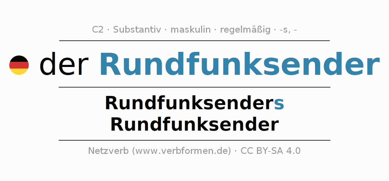 - Singular: der Rundfunksender, des Rundfunksenders, dem Rundfunksender, den Rundfunksender