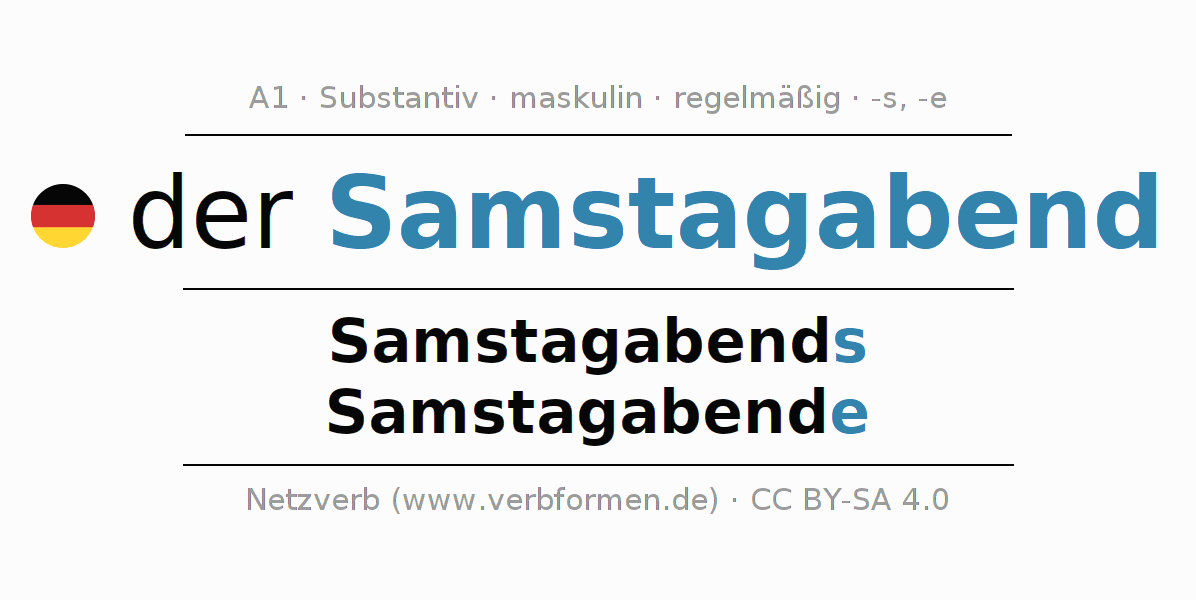 - Singular: der Samstagabend, des Samstagabends, dem Samstagabend, den Samstagabend