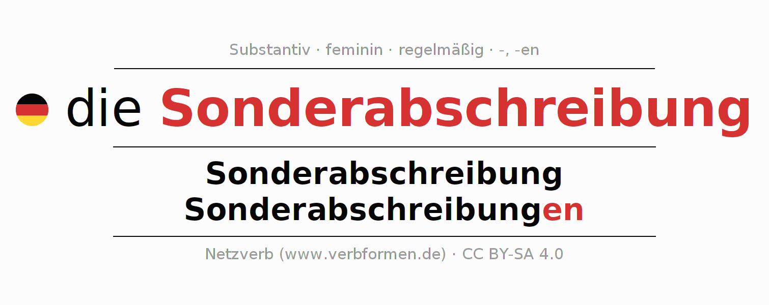 - Plural: die Sonderabschreibungen, der Sonderabschreibungen, den Sonderabschreibungen, die Sonderabschreibungen