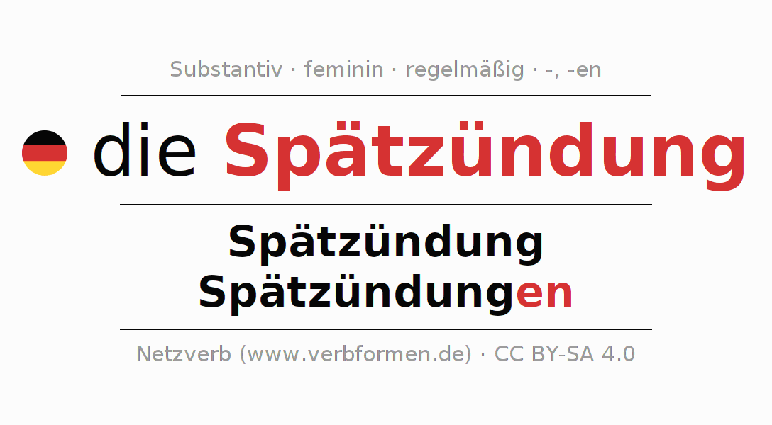 - Singular: die Spätzündung, der Spätzündung, der Spätzündung, die Spätzündung