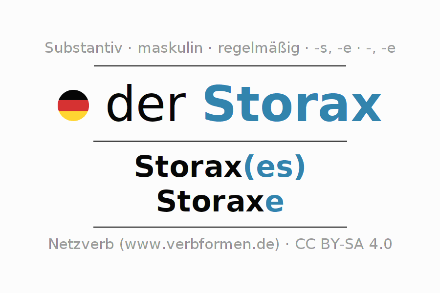 - Singular: der Storax, des Storax(es), dem Storax(e), den Storax