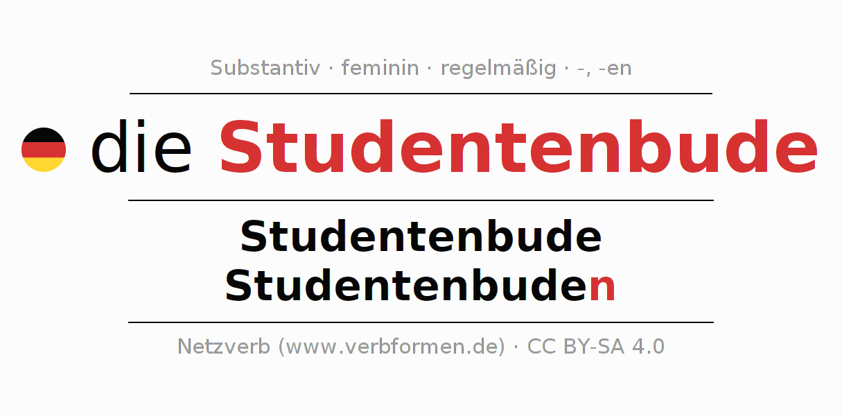 Die Deklination des Substantivs Studentenbude ist im Singular Genitiv Studentenbude und im Plural Nominativ Studentenbuden. Das Nomen Studentenbude wird schwach mit den Deklinationsendungen -/n dekliniert. Das Genus bzw. grammatische Geschlecht von Studentenbude ist Feminin und der bestimmte Artikel ist "die". Man kann hier nicht nur Studentenbude deklinieren, sondern alle deutschen Substantive. Kommentare ☆