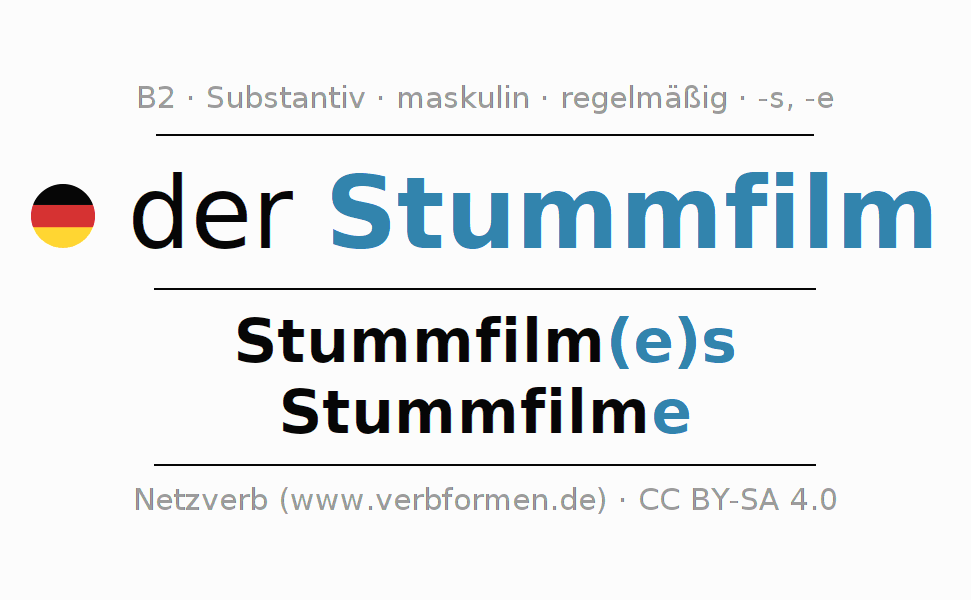 - Plural: die Stummfilme, der Stummfilme, den Stummfilmen, die Stummfilme
