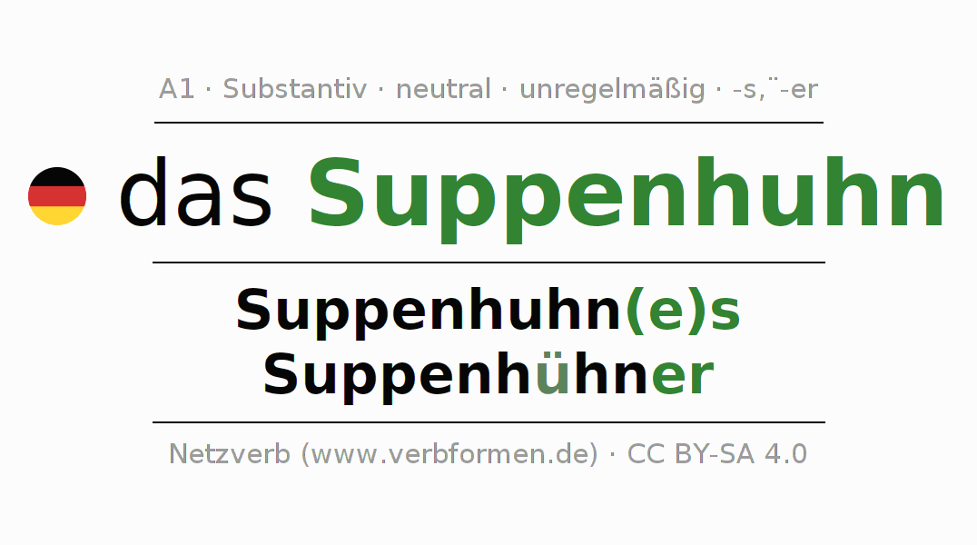 Die Deklination des Substantivs Suppenhuhn ist im Singular Genitiv Suppenhuhn(e)s und im Plural Nominativ Suppenhühner. Das Nomen Suppenhuhn wird stark mit den Deklinationsendungen es/ü-er dekliniert. Im Plural steht ein Umlaut. Das Genus bzw. grammatische Geschlecht von Suppenhuhn ist Neutral und der bestimmte Artikel ist "das". Man kann hier nicht nur Suppenhuhn deklinieren, sondern alle deutschen Substantive. Das Substantiv gehört zum Wortschatz des Zertifikats Deutsch bzw. zur Stufe A1. Kommentare ☆