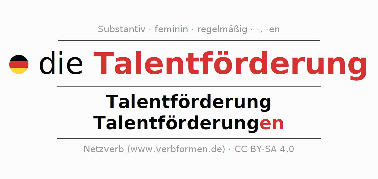 - Plural: die Talentförderungen, der Talentförderungen, den Talentförderungen, die Talentförderungen