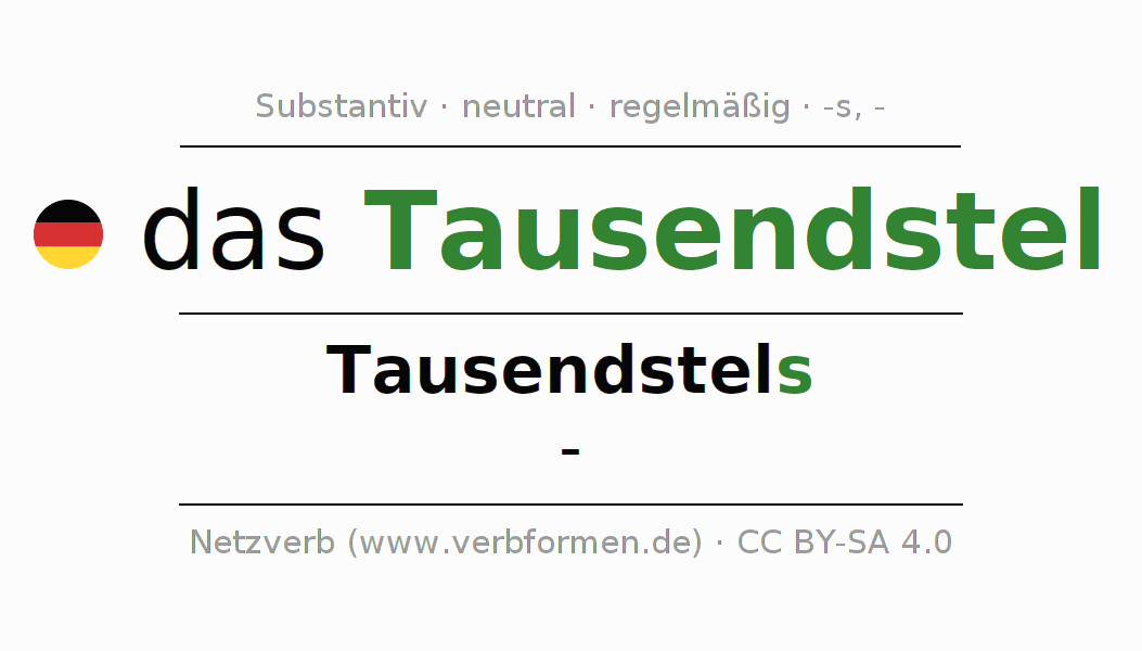 Die das Tausendstel Deklination online als Deklinationstabelle mit allen Formen im Singular (Einzahl) und im Plural (Mehrzahl) und in allen vier Fällen Nominativ (auch 1. Fall, Wer-Fall), Genitiv (auch 2. Fall, Wes-Fall, Wessen-Fall), Dativ (auch 3. Fall, Wem-Fall) und Akkusativ (auch 4. Fall, Wen-Fall) übersichtlich als Tabelle dargestellt. Die Beugung bzw. Deklination des Nomens das Tausendstel ist somit eine Hilfestellung für Hausaufgaben, Prüfungen, Klausuren, für den Deutschuntericht der Schule, zum Deutsch Lernen, für das Studium, Deutsch als Fremdsprache (DaZ), Deutsch als Zweitsprache (DaZ) und für die Erwachsenenbildung. Gerade auch für Deutsch-lernende ist die korrekte Deklination des Wortes das Tausendstel entscheidend. Weitere Informationen finden sich unter Wiktionary das Tausendstel und unter das Tausendstel im Duden.