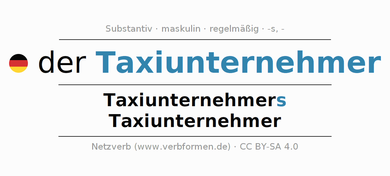 - Plural: die Taxiunternehmer, der Taxiunternehmer, den Taxiunternehmern, die Taxiunternehmer