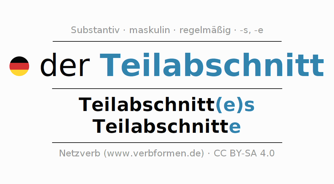 - Singular: der Teilabschnitt, des Teilabschnitt(e)s, dem Teilabschnitt(e), den Teilabschnitt