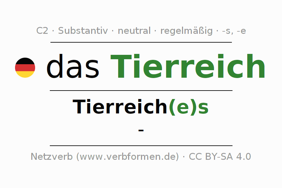 Die Deklination des Substantivs Tierreich ist im Singular Genitiv Tierreich(e)s und im Plural Nominativ -. Das Nomen Tierreich wird stark mit den Deklinationsendungen es/- dekliniert. Es bildet keine Pluralformen. Das Genus bzw. grammatische Geschlecht von Tierreich ist Neutral und der bestimmte Artikel ist "das". Man kann hier nicht nur Tierreich deklinieren, sondern alle deutschen Substantive. Das Substantiv gehört zum Wortschatz des Zertifikats Deutsch bzw. zur Stufe C2. Kommentare ☆