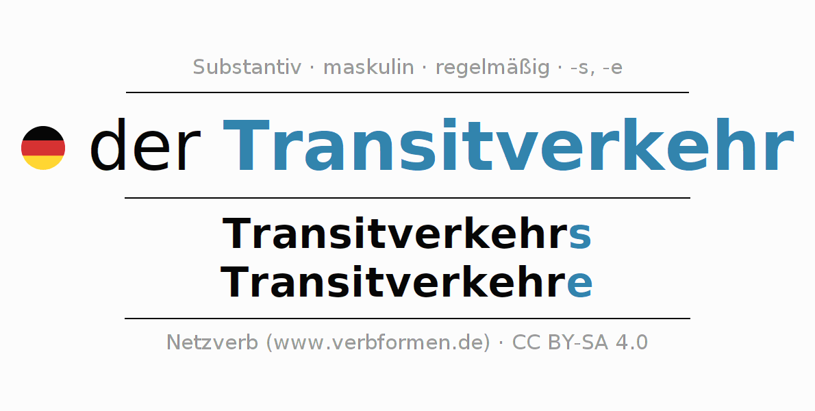 - Singular: der Transitverkehr, des Transitverkehrs, dem Transitverkehr, den Transitverkehr