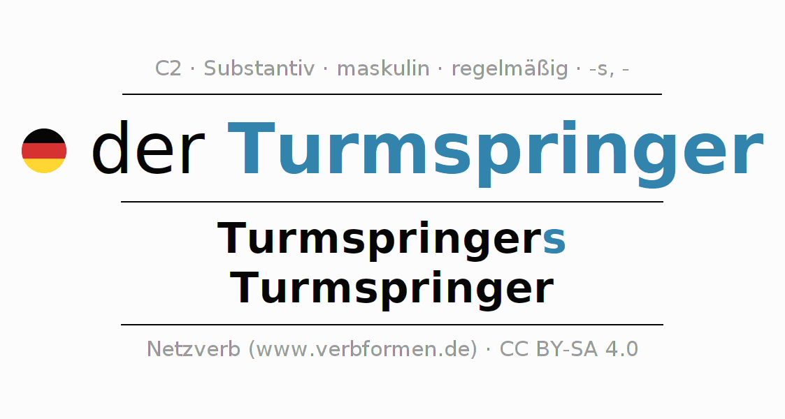 - Singular: der Turmspringer, des Turmspringers, dem Turmspringer, den Turmspringer