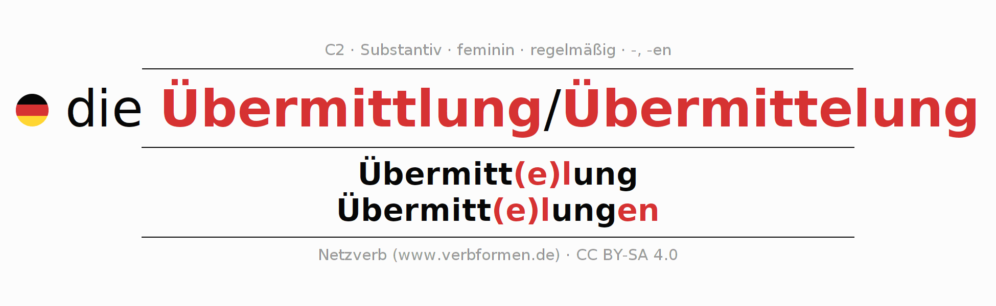 | Nom. | die Übermitt(e)lung | die Übermitt(e)lungen |