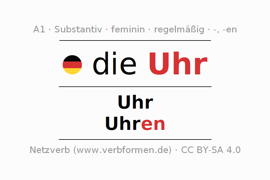 - Plural: die Uhren, der Uhren, den Uhren, die Uhren