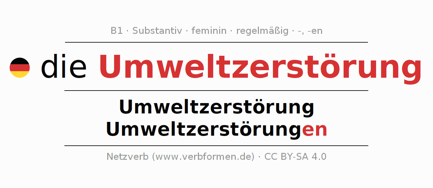- Singular: die Umweltzerstörung, der Umweltzerstörung, der Umweltzerstörung, die Umweltzerstörung