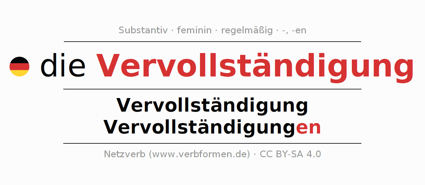 - Singular: die Vervollständigung, der Vervollständigung, der Vervollständigung, die Vervollständigung