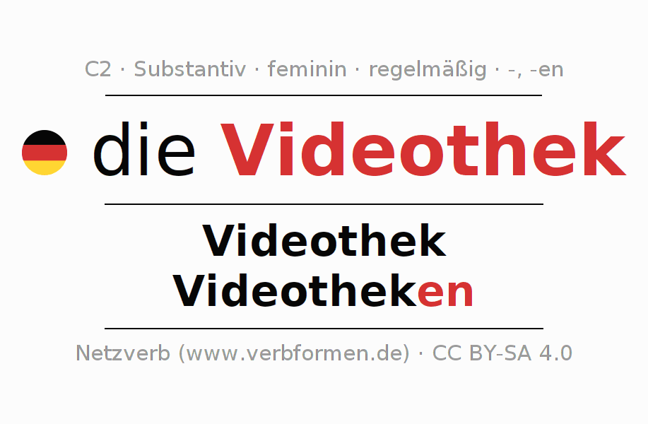 - Plural: die Videotheken, der Videotheken, den Videotheken, die Videotheken