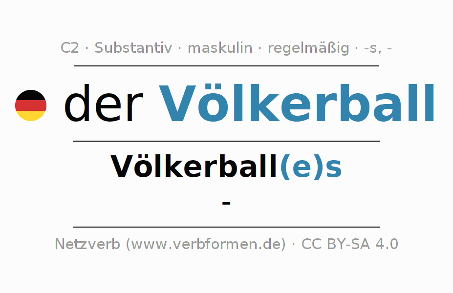 - Singular: der Völkerball, des Völkerball(e)s, dem Völkerball(e), den Völkerball
