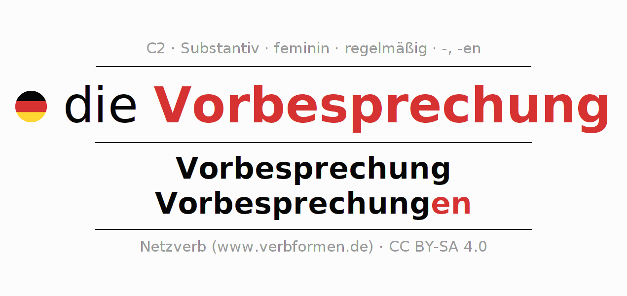 - Plural: die Vorbesprechungen, der Vorbesprechungen, den Vorbesprechungen, die Vorbesprechungen