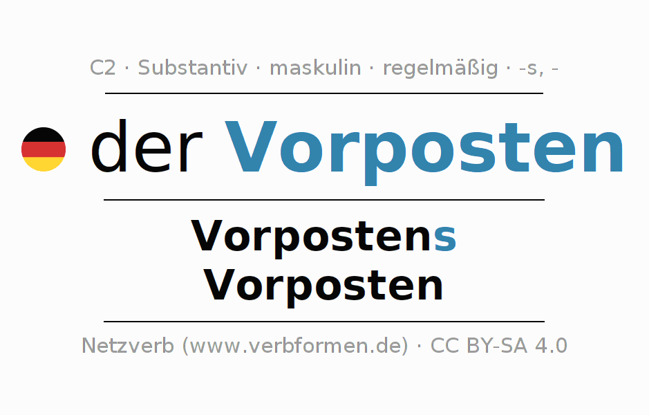 - Singular: der Vorposten, des Vorpostens, dem Vorposten, den Vorposten