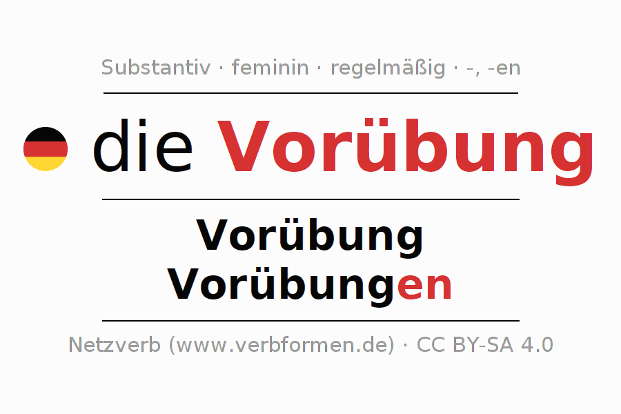 Die Deklination des Substantivs Vorübung ist im Singular Genitiv Vorübung und im Plural Nominativ Vorübungen. Das Nomen Vorübung wird schwach mit den Deklinationsendungen -/en dekliniert. Das Genus bzw. grammatische Geschlecht von Vorübung ist Feminin und der bestimmte Artikel ist "die". Man kann hier nicht nur Vorübung deklinieren, sondern alle deutschen Substantive. Kommentare ☆
