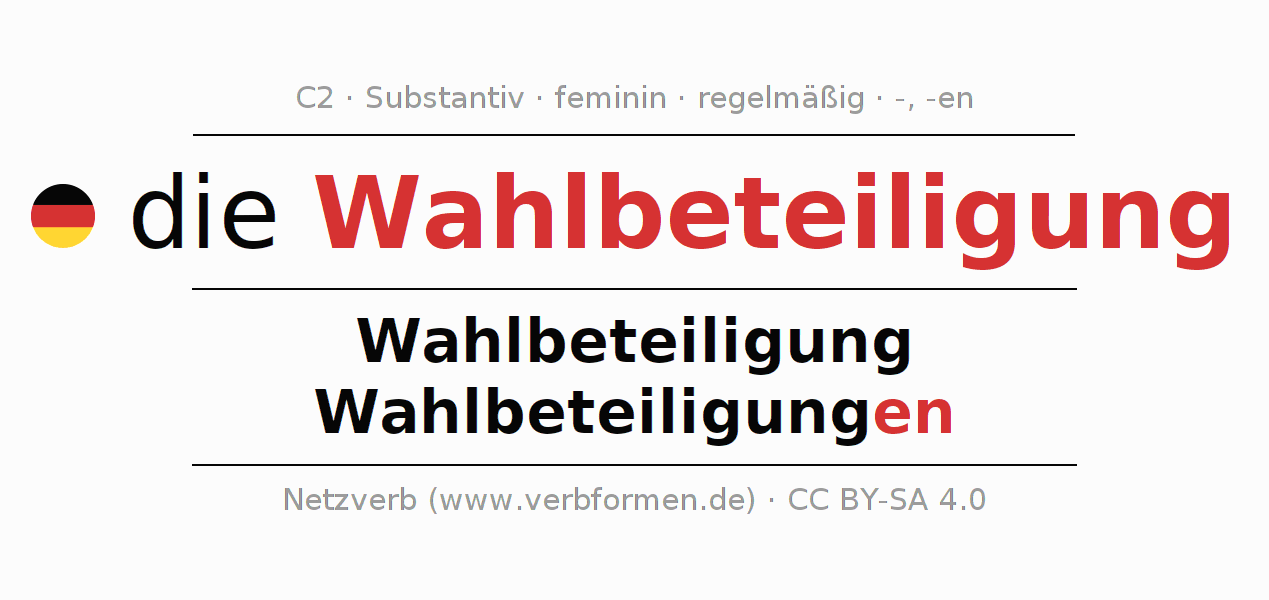 - Singular: die Wahlbeteiligung, der Wahlbeteiligung, der Wahlbeteiligung, die Wahlbeteiligung