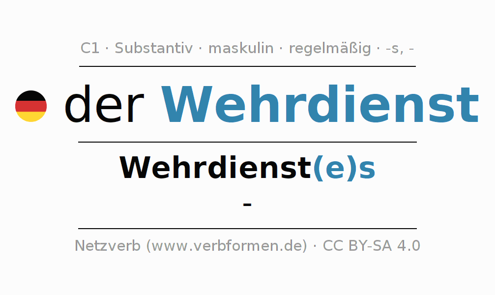 Die Deklination des Substantivs Wehrdienst ist im Singular Genitiv Wehrdienst(e)s und im Plural Nominativ -. Das Nomen Wehrdienst wird stark mit den Deklinationsendungen es/- dekliniert. Es bildet keine Pluralformen. Das Genus bzw. grammatische Geschlecht von Wehrdienst ist Maskulin und der bestimmte Artikel ist "der". Man kann hier nicht nur Wehrdienst deklinieren, sondern alle deutschen Substantive. Das Substantiv gehört zum Wortschatz des Zertifikats Deutsch bzw. zur Stufe C1. Kommentare ☆