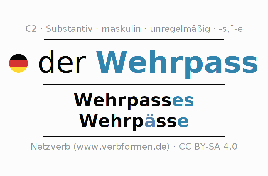 - Singular: der Wehrpass, des Wehrpasses, dem Wehrpass(e), den Wehrpass