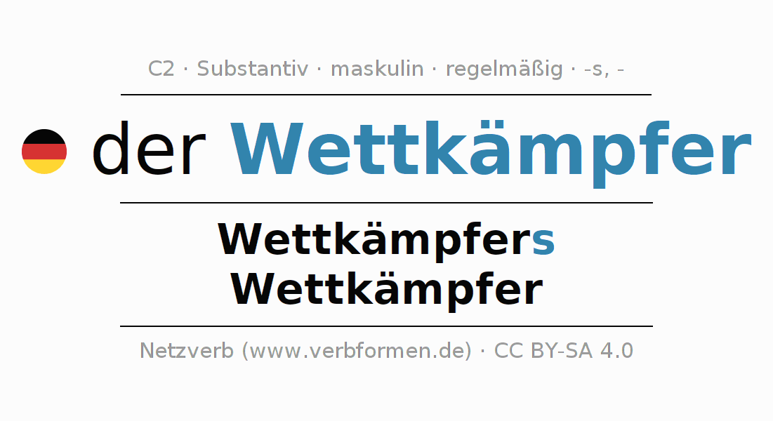 - Plural: die Wettkämpfer, der Wettkämpfer, den Wettkämpfern, die Wettkämpfer