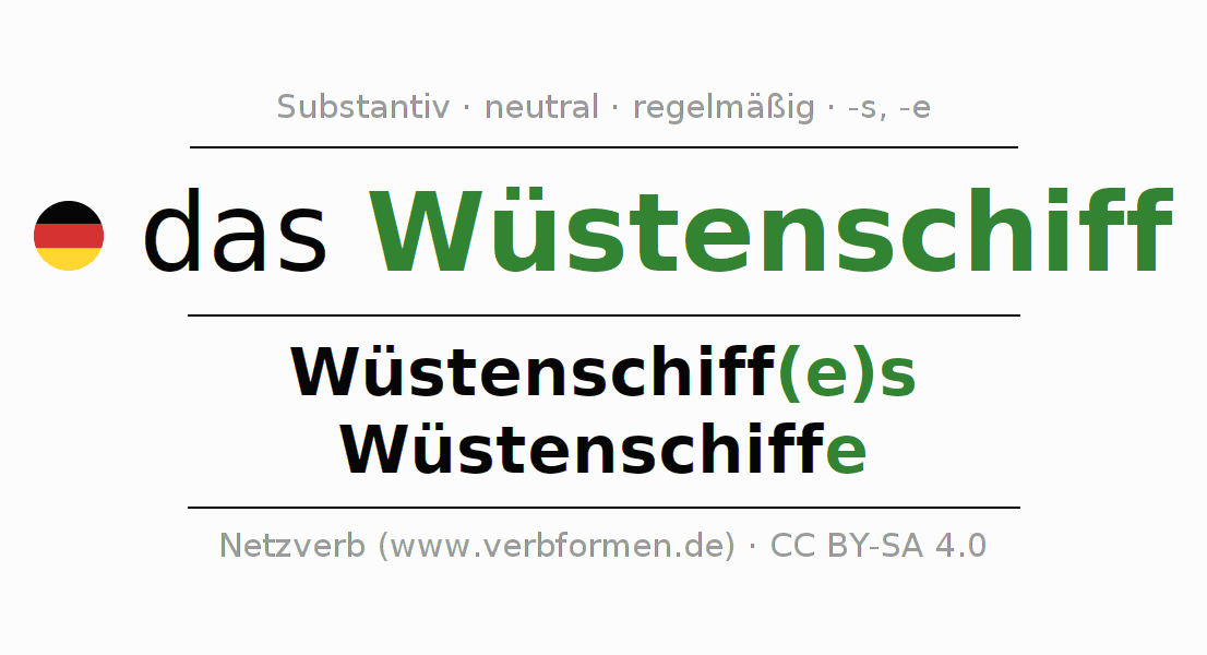 - Plural: die Wüstenschiffe, der Wüstenschiffe, den Wüstenschiffen, die Wüstenschiffe