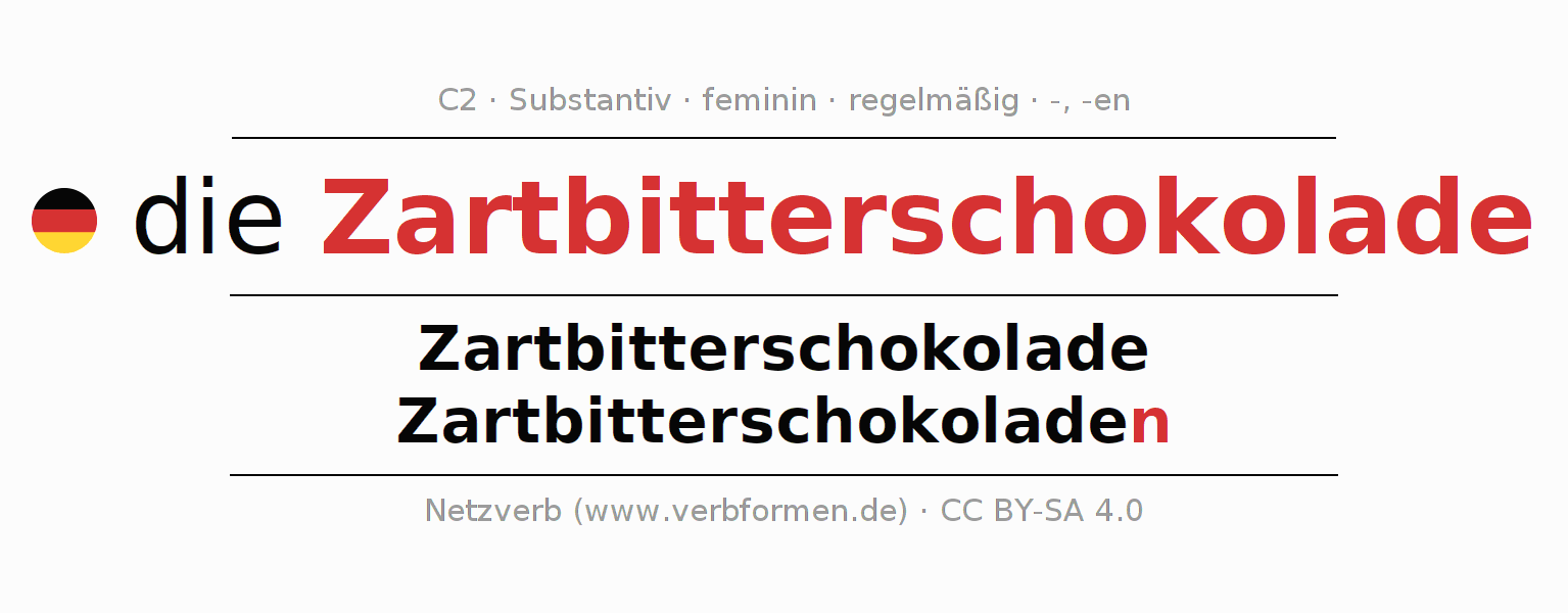 - Singular: die Zartbitterschokolade, der Zartbitterschokolade, der Zartbitterschokolade, die Zartbitterschokolade