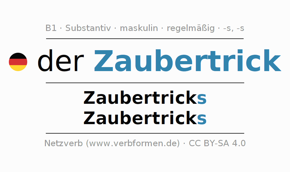 - Singular: der Zaubertrick, des Zaubertricks, dem Zaubertrick, den Zaubertrick