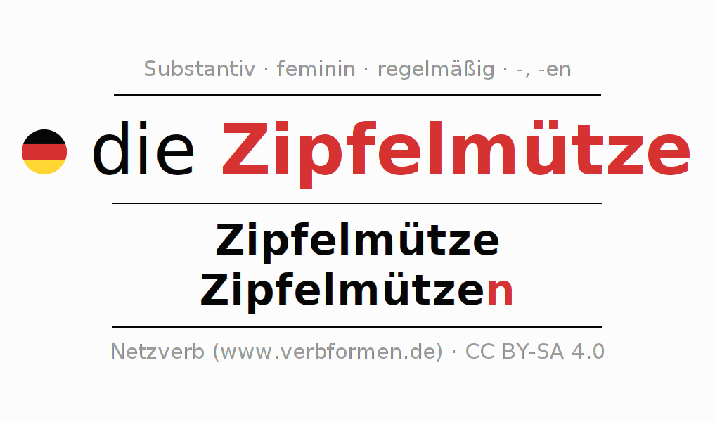 - Singular: die Zipfelmütze, der Zipfelmütze, der Zipfelmütze, die Zipfelmütze