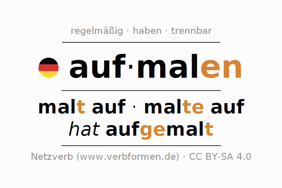 - Präsens: mal(e) (du) auf, malen wir auf, malt (ihr) auf, malen Sie auf