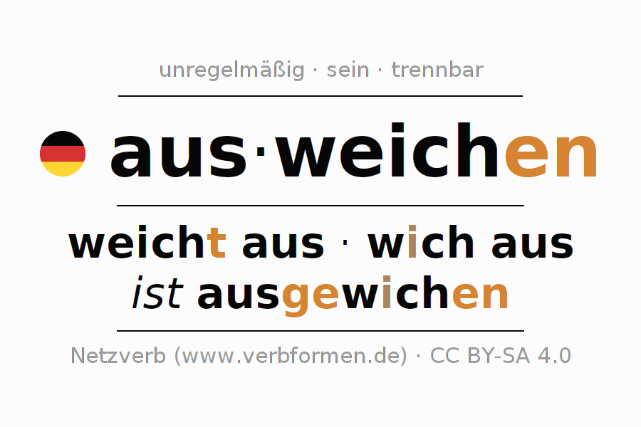 - Präsens: weich(e) (du) aus, weichen wir aus, weicht (ihr) aus, weichen Sie aus
