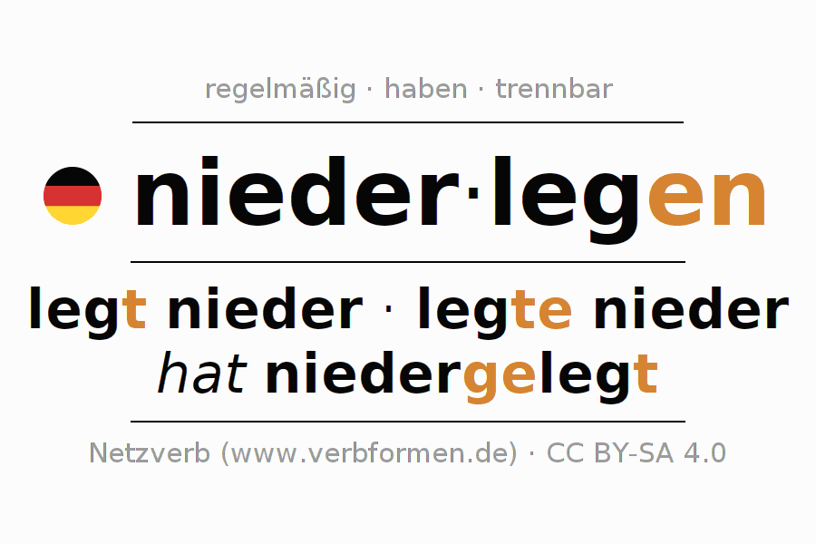 - Präsens: leg(e) (du) nieder, legen wir nieder, legt (ihr) nieder, legen Sie nieder
