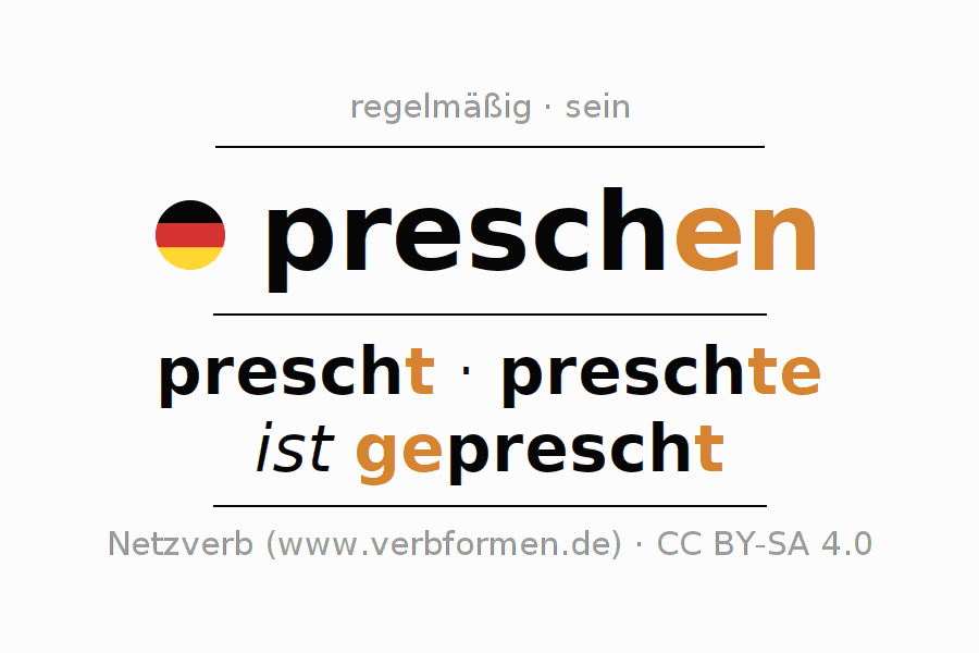 - Präsens: presch(e) (du), preschen wir, prescht (ihr), preschen Sie