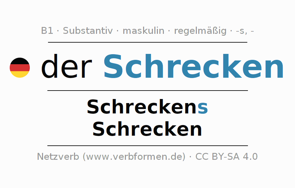 - Singular: der Schrecken, des Schreckens, dem Schrecken, den Schrecken