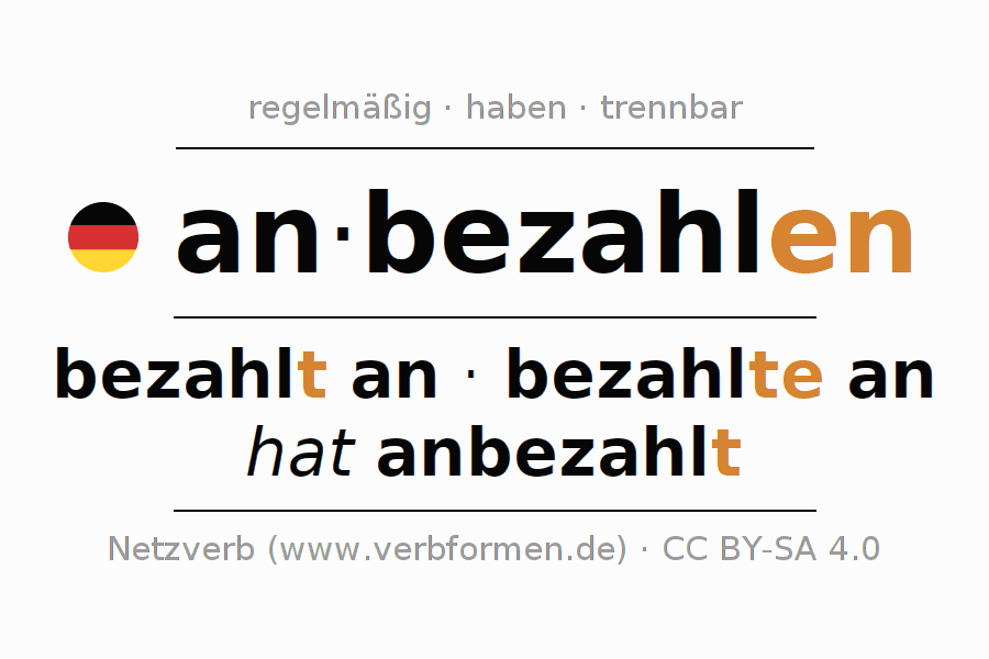 - Präsens: bezahl(e) (du) an, bezahlen wir an, bezahlt (ihr) an, bezahlen Sie an