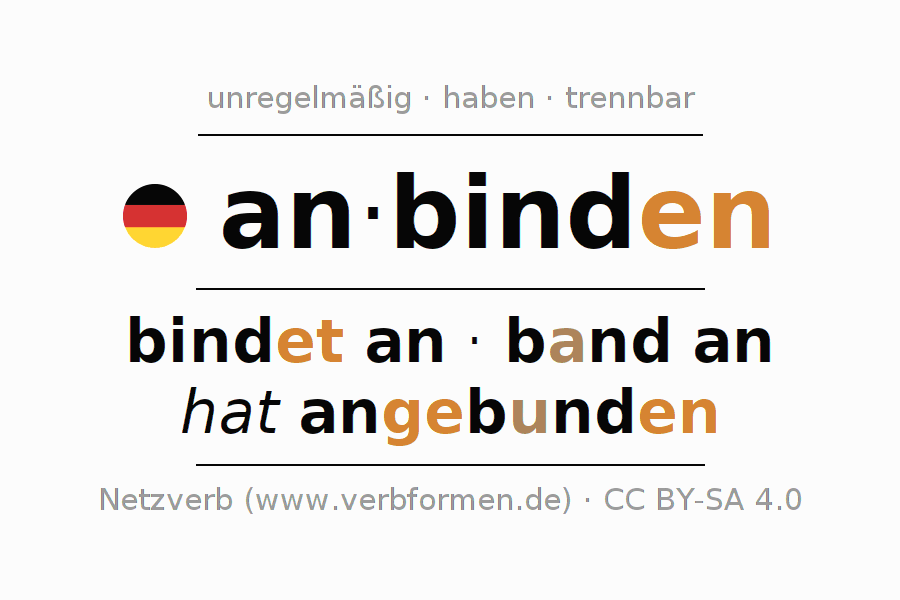 - Präsens: bind(e) (du) an, binden wir an, bindet (ihr) an, binden Sie an