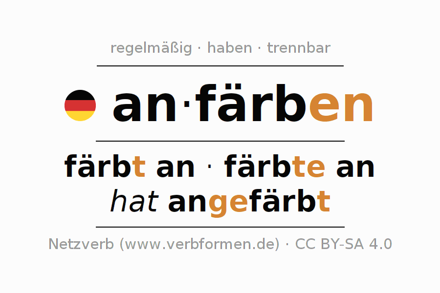 - Präsens: färb(e) (du) an, färben wir an, färbt (ihr) an, färben Sie an