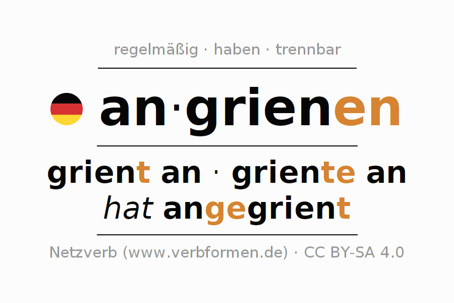 - Perfekt: ich habe angegrient, du hast angegrient, er hat angegrient, wir haben angegrient, ihr habt angegrient, sie haben angegrient