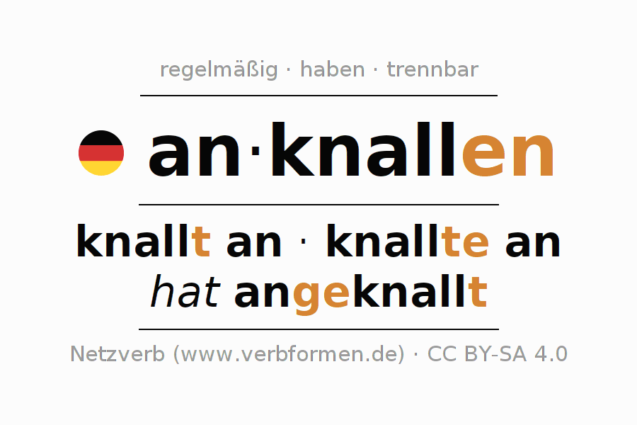 - Präsens: ich knall(e) an, du knallst an, er knallt an, wir knallen an, ihr knallt an, sie knallen an