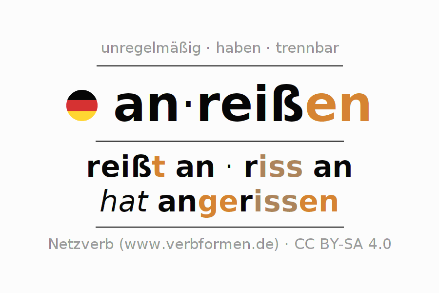 - Präsens: reiß(e) (du) an, reißen wir an, reißt (ihr) an, reißen Sie an