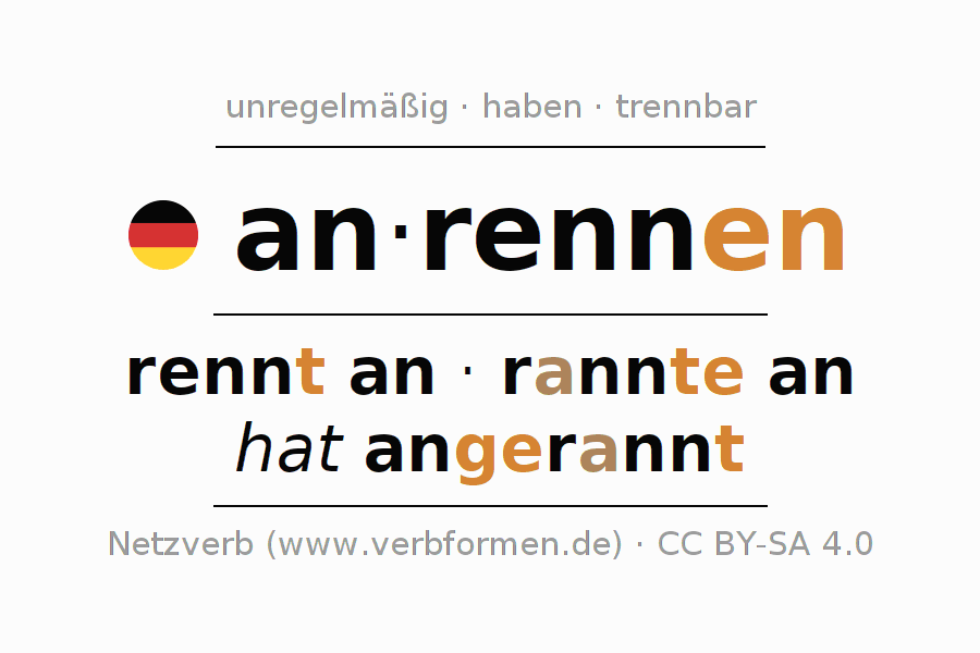 - Präsens: renn(e) (du) an, rennen wir an, rennt (ihr) an, rennen Sie an