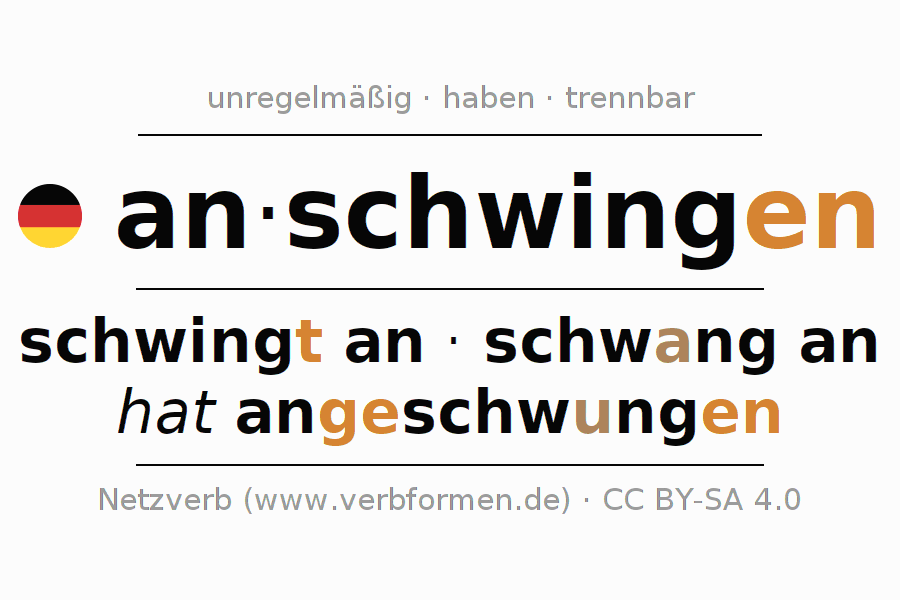 - Präsens: schwing(e) (du) an, schwingen wir an, schwingt (ihr) an, schwingen Sie an